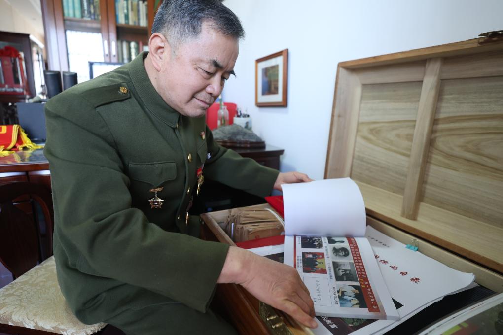 军人出身的陈相珍,退休后一直致力挖掘淠河东路的红色故事。查资料、阅档案、一户户走访考证……如今,这条路上英雄的照片、手稿、勋章等,已填满了家里的红色木箱。