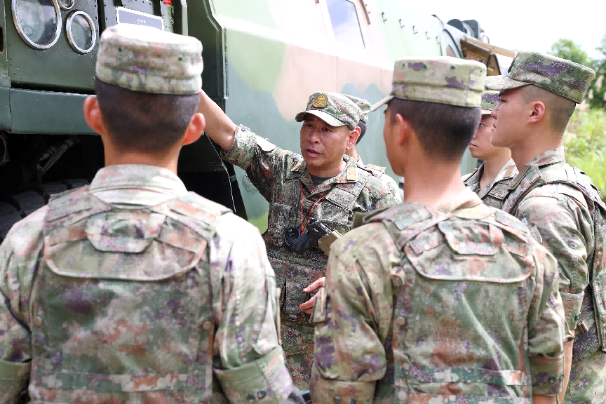 ↑何贤达(中)为新号手讲解装备操作技巧。程李航 摄