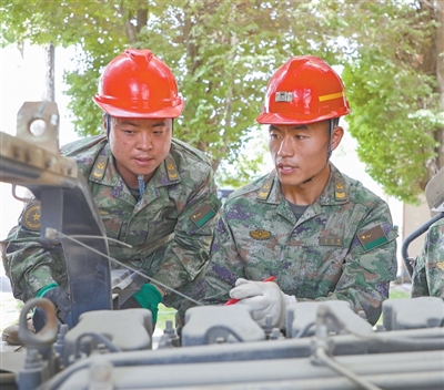 雷耀明(右)向战友讲解装备维修技巧。马新周摄(新华社发)