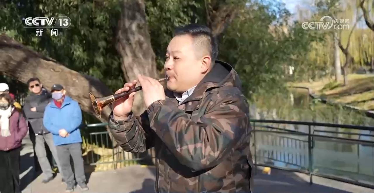 一首唢呐的经典名曲《百鸟朝凤》,吸引的不只是周围遛弯的人,吹奏声中,鸟群从众人头上一遍遍飞过的场景,更是令人惊叹。演奏员吹到起劲儿处,鸟儿更是落到了头顶树上停了下来,这精彩的一幕没有彩排,引得周围叫好一片。演奏员,是北京民族乐团唢呐首席王向阳。
