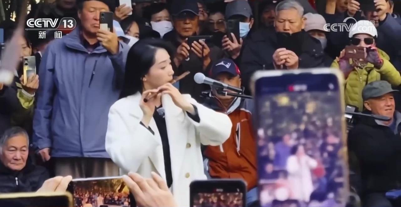 更有趣的反差是,这个自称重度社恐、“纯i人”的姑娘,却在被众人围观的过程中,意外地被治愈了。起初,她只是应观众点歌,埋头吹奏。但渐渐地,递上来的暖手宝和热水,一声声真诚的喝彩,让她感受到了周围人的善意和温暖。在这个没有观众席和表演区泾渭分明的舞台中,她能看清每一张脸上的表情,也能更近距离地与大家分享音乐和心情。